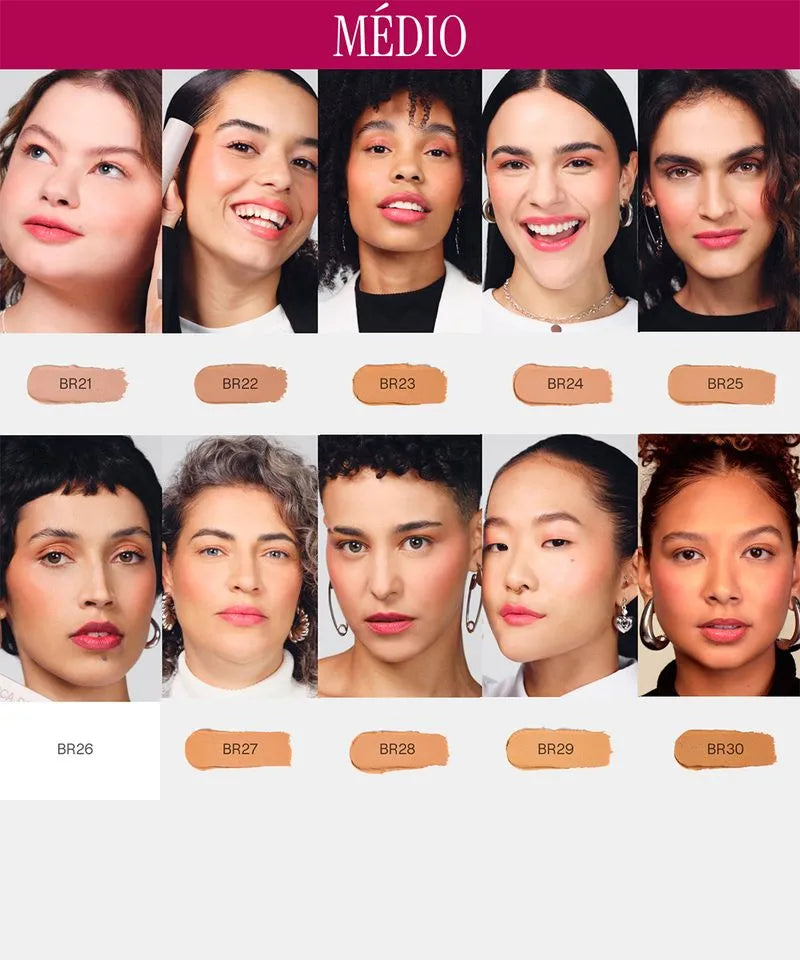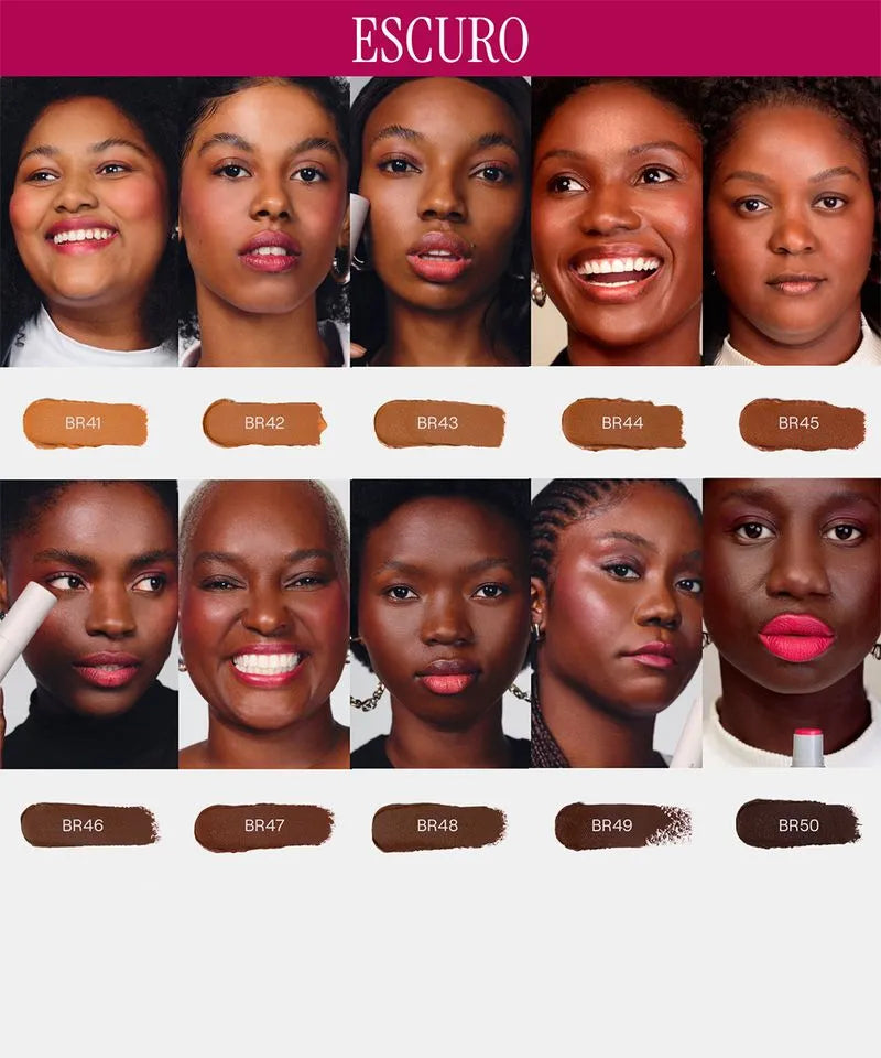 São três funções - base, contorno e corretivo. Disponível em 50 tonalidades que celebram a pluralidade de cada tom de pele, pioneira em representar a brasilidade.