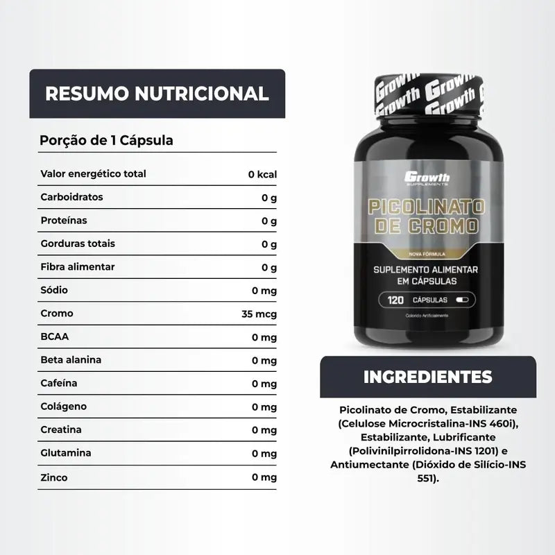 A indicação da Growth Supplements é consumir o picolinato nas refeições que antecedem o treino. No picolinato de cromo, efeitos colaterais são raros, mas é preciso ficar atento à quantidade indicada pelo nutricionista e não ingerir em excesso.